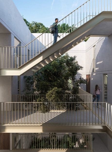 The apartments have a Roof Garden, central patio, outdoor seating area, and 11 storage drawers parking lot.